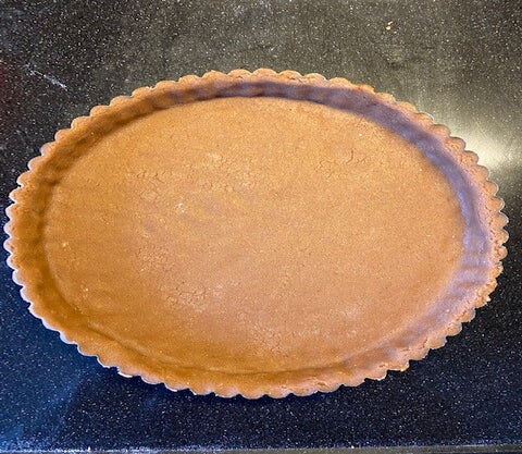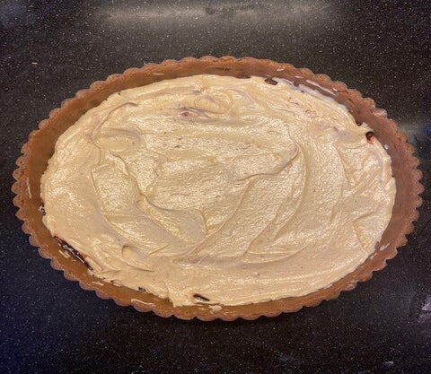 Voor deze taart gebruik ik een tartelette bakvorm van 24 cm met losse bodem. Smeer in met boter, en leg aan de kant. Rol het speculaasdeeg uit tot ongeveer 4 millimeter dik. Bebloem de werkbank regelmatig zodat je voor komt dat het deeg blijft plakken aan de werkbank of je rolstok. Rol vervolgens het deeg losjes om je rolstok en rol hem dan weer uit over de beboterde bakvorm. Vorm hem in de bakvrom tot hij goed tegen de rand aan zit. Druk, rol of snij de overtollige deeg eraf en bewaar het deeg wat over is in de vriezer voor een ander moment. ( Je kunt hier prima een speculaas brok van maken. Bak hem op 150 C ongeveer 25 min.)
